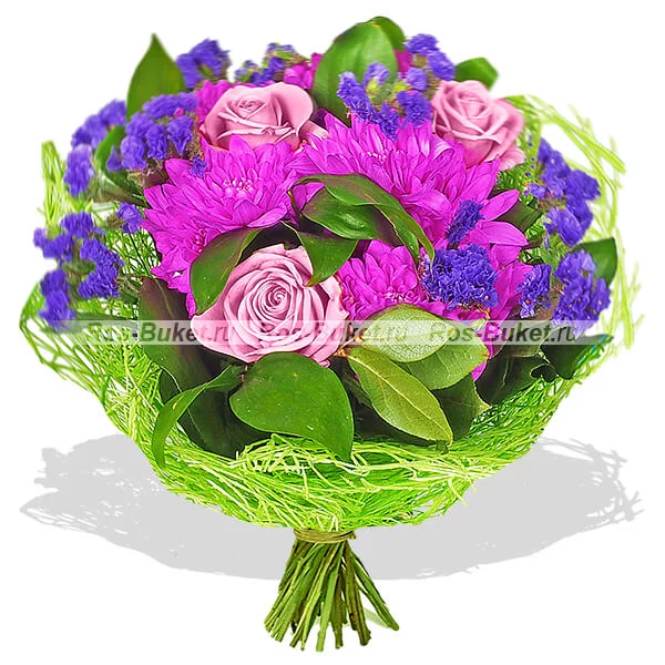 Стандартный (на фото): роза розовая - 3 шт, хризантема кустовая розовая (малиновая) - 4 шт, статица - 3 шт,  салал, натуральная сетка (зеленая).